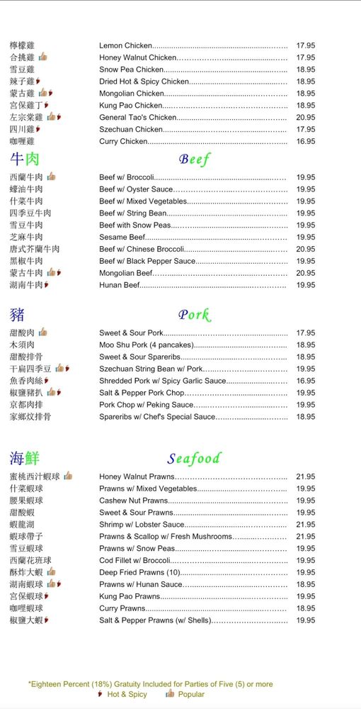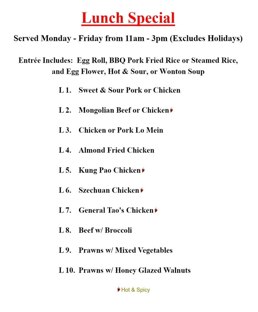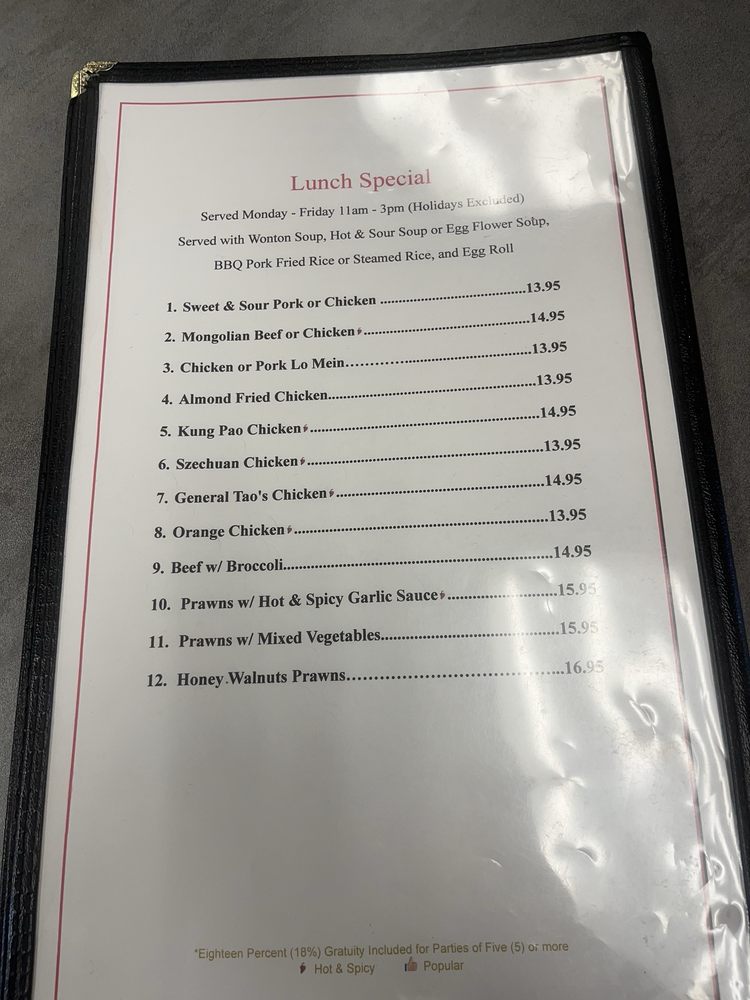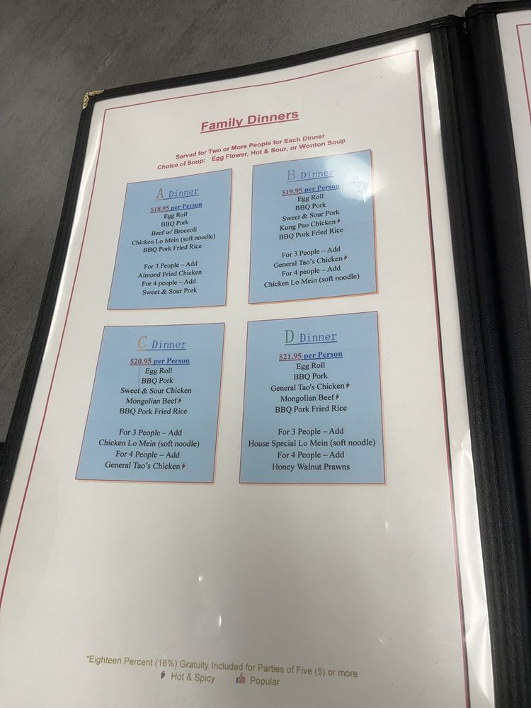Egg roll, BBQ pork, General Tao's chicken, Mongolian beef, and BBQ pork fried rice. For 3 people includes house special lo mein, for 4 people includes house special lo mein and prawns w/ honey glazed walnuts.